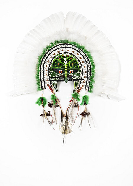 Joel Sam, Aybodh Dhoeri Mawa from the Kulba Igilinga (Old Culture) series, 2020, artificial feather, emu feather, banana leaf, foam, acrylic paint, glass, dowel, seashell, twine, cane, Matchbox Bean nuts seed pods, vinyl, mother of pearl and raffia, Purchased Cairns Art Gallery 2021, Commissioned by Cairns Art Gallery
