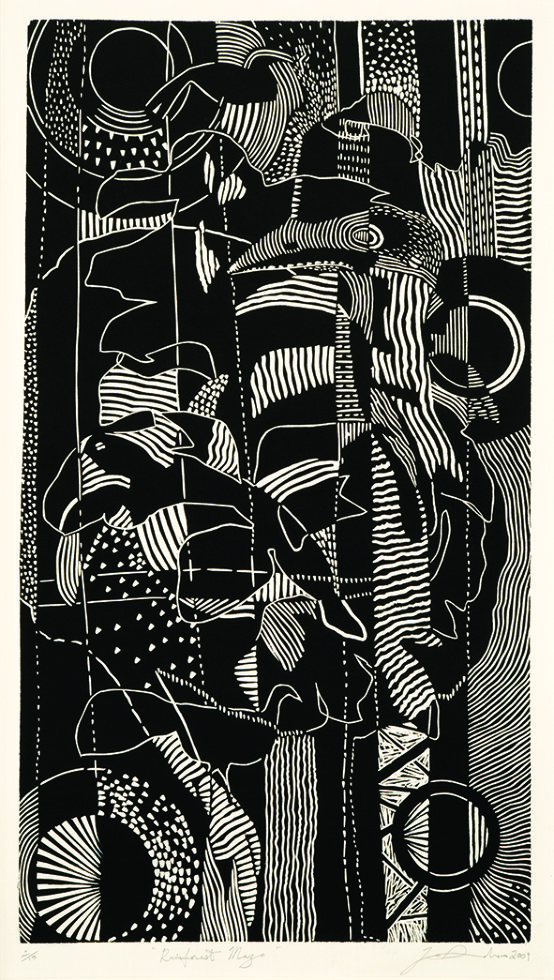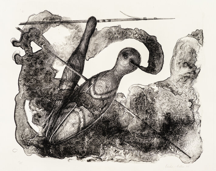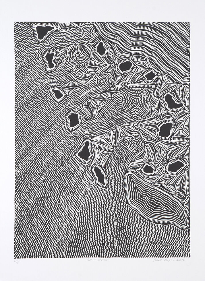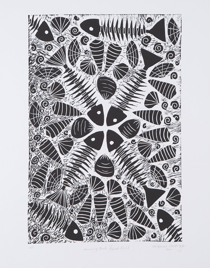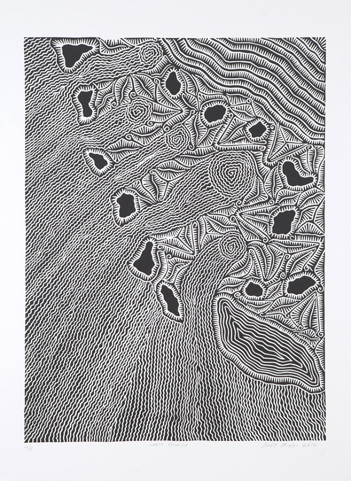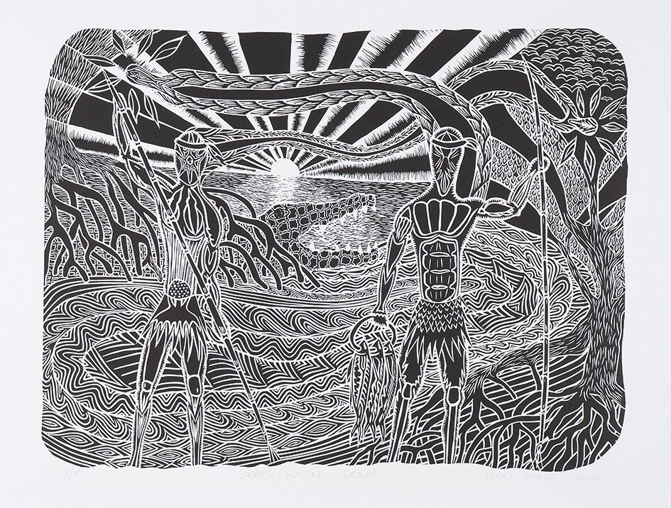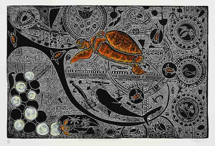 Far North Queensland is a vast region bounded by rainforest clad mountains to the west, and turquoise-blue oceans and sprawling reef systems to the east. These two worlds are rich in exotic flora and fauna which continue to be a source of inspiration for artists. Through linocuts, vinyl cuts, screen prints, etchings, and lithographs works in the exhibition speak about custodianship of country and the importance of winds, weather and seasons; hunting and gathering; and objects infused with cultural significance.