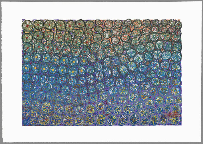 Seasons and their markers are recorded by Guugu Yimithirr artist Roy McIvor (1934–2018) in his works Bubu Gunbi ‘Dry’ (Earth Blood) and Buurraraay Milbaal ‘Wet’ (Water-Tears-Renewal). They capture the colours and patterns associated with the lead up to the wet season – from the burning-off of the parched land to the onset of the final deluging rains.